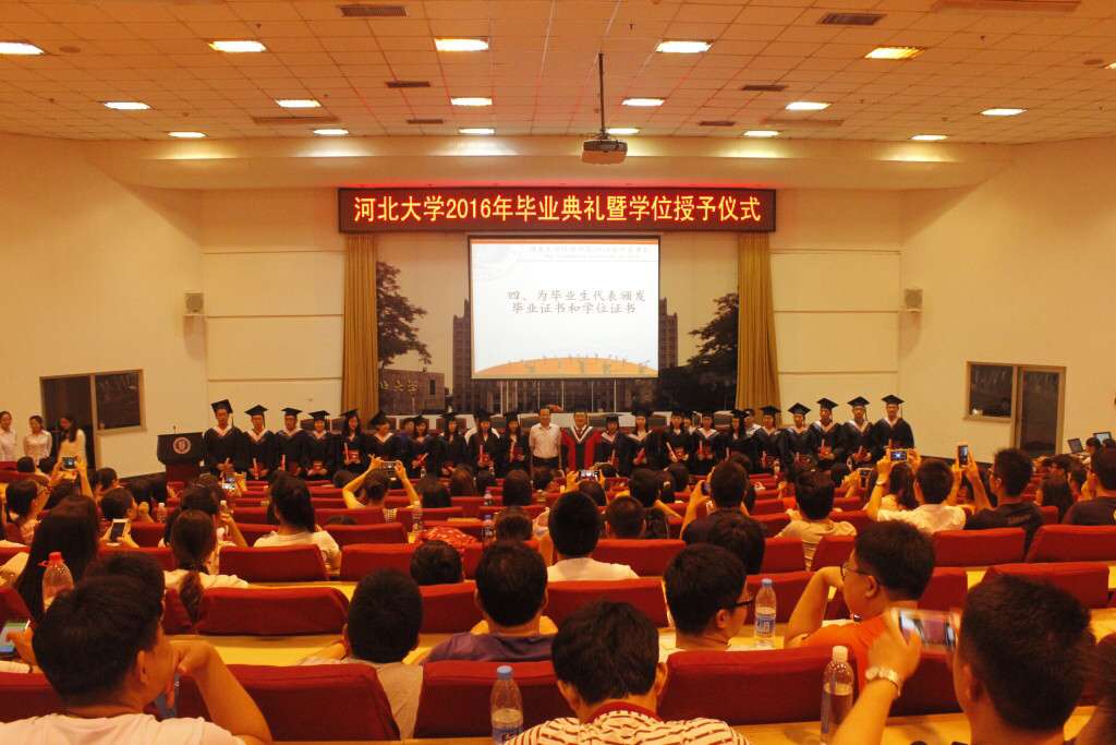 首先由李惠茹教授宣布学校关于授予2012级毕业生学士学位证书的决定。随后,伴随着喜庆欢快的音乐声,20名身着学士服的毕业生代表迈着整齐的步伐踏上主席台,由王余丁书记和王金营院长授学士学位并扶正流苏。紧接着由毕业生代表陈晨同学发言,她表达了对学校、学院的感激,同时也向学校学院保证在今后的工作生活中努力拼搏,做一个对社会有用的人,她明白毕业并不意味着学习的结束,“雄关漫道真如铁,而今迈步从头越。”今后仍然需要不断的学习充实自己丰富自己。接下来在校生胡晨同学代表全体在校生送出对学长学姐的祝福。教师代表吴宇老师语重心长的发言,表达了老师们对毕业生的殷切希望与祝福。最后王金营院长总结发言,对2012级毕业生表示祝贺,他在致辞中提到,走出河大并不意味着学习生涯的结束,恰恰相反,“学习是终身的职业”。最后毕业典礼在河北大学校歌中落下帷幕。