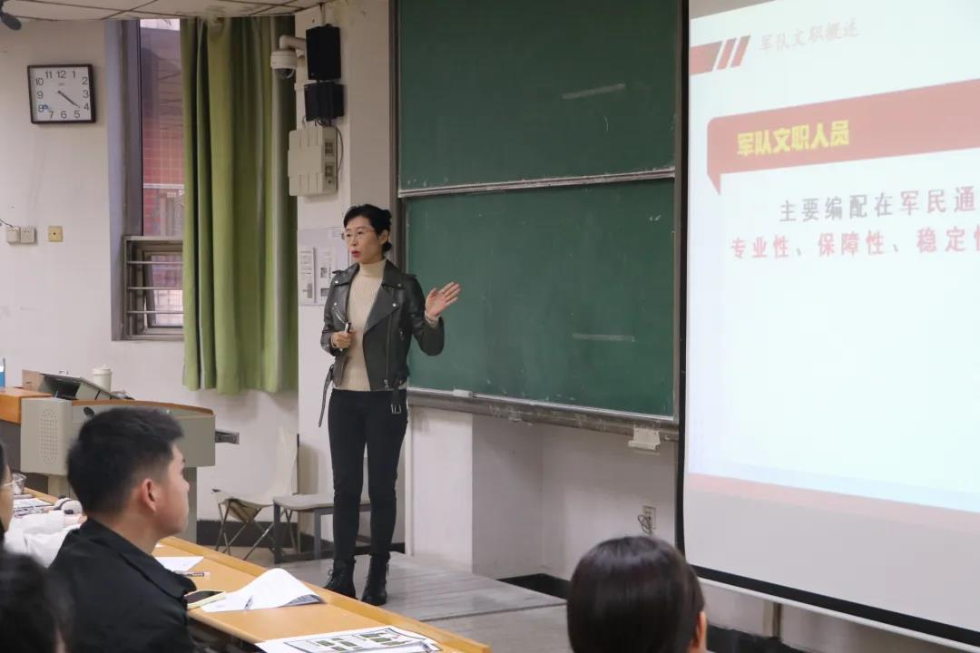 王瑶从多个角度系统全面讲解了文职制度的历史沿革、文职人员身份属性、文职人员岗位设置、文职人员待遇保障、文职人员日常管理以及文职人员发展前景等内容。她提到,军队文职是近年来国家推出的一项重要的军队人员制度改革举措,是军队建设不可或缺的一部分